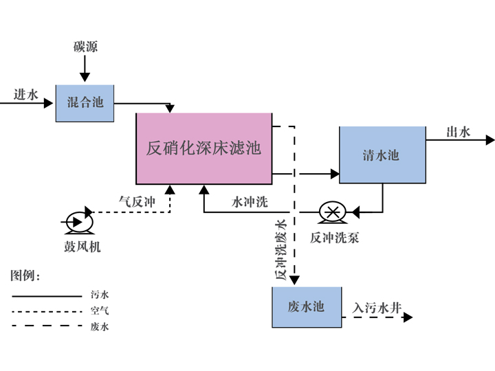 反硝化深床濾池工藝是集生物脫氮及過濾功能合二為一的處理單元,是脫氮及過濾并舉的處理工藝。大多數(shù)濾池表層容易堵塞或板結(jié),很快失去水頭,而反硝化深床濾池的均質(zhì)石英砂允許固體雜質(zhì)透過濾床的表層,深入濾池的濾料中,達(dá)到整個濾池縱深截留固體物的要求。