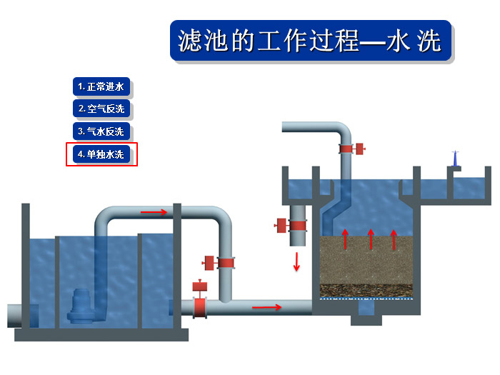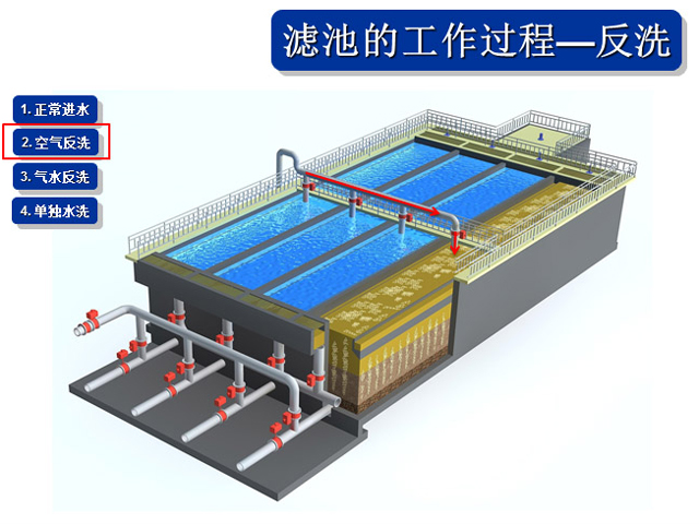 1、氣水聯(lián)合反沖冼裝置、布?xì)庋b置、操作工藝等系統(tǒng)集成技術(shù)解決直接過濾、生物濾池生物膜脫落堵塞濾池的問題。